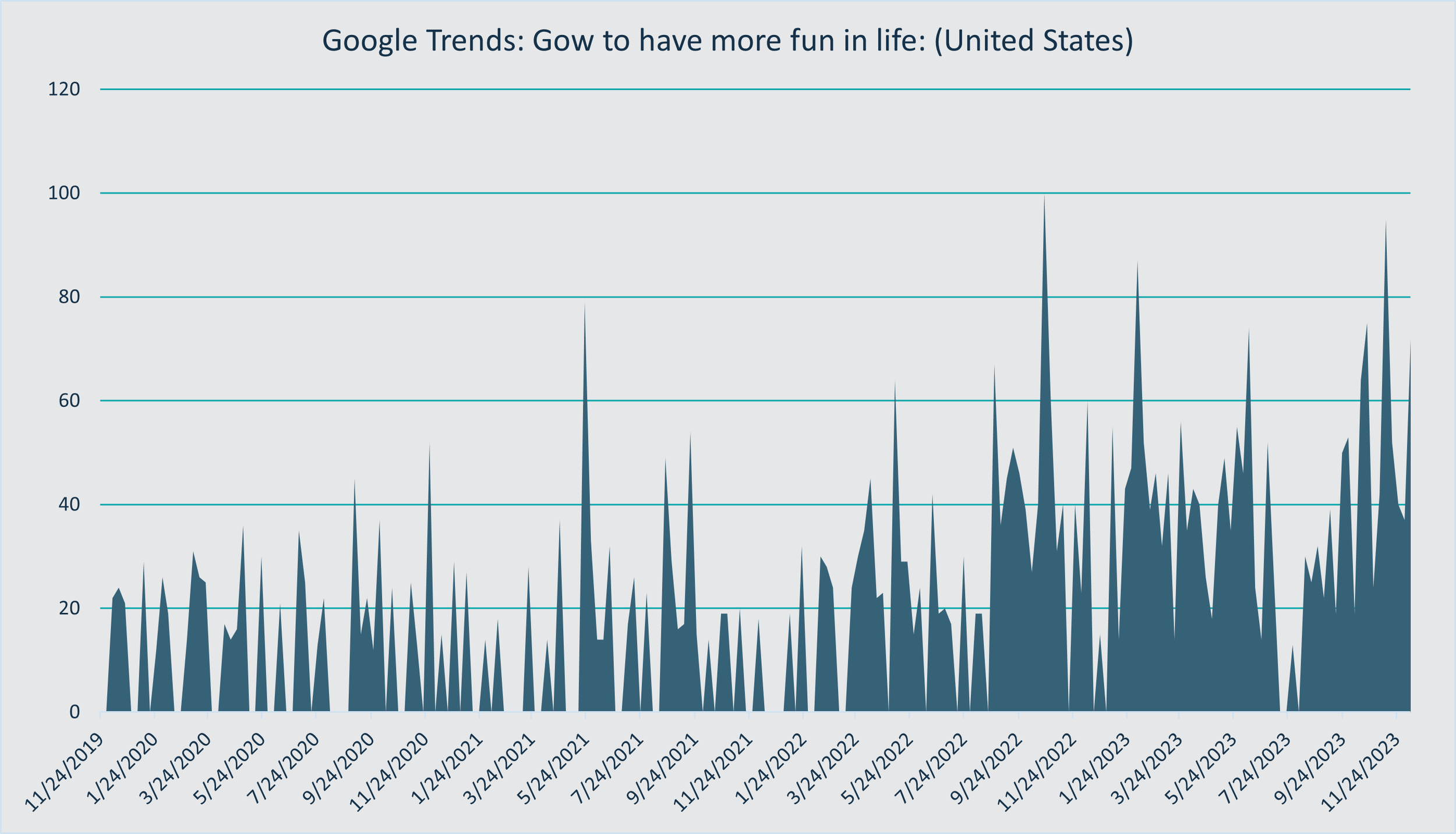 In a world of uncertainty and negative news, people actively seek joy and escapism. Since November 2019, searches for "how to have more fun in life" have seen a significant uptick. You can help to fill this desire for more fun and levity by showing how your product or service already brings this into your customers' lives and adding a marketing strategy that brings joy, resonates with optimism, and offers a welcome escape from the challenges of everyday life.