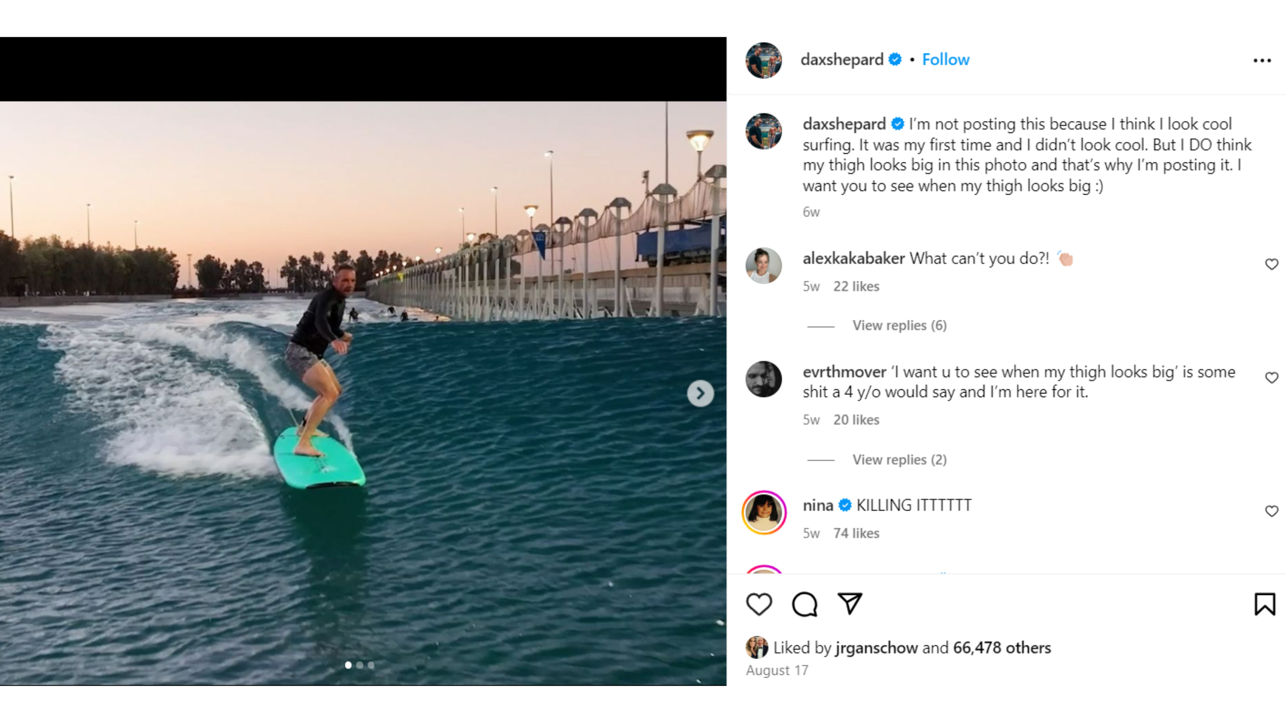 Surfing for the First Time - is relatable by admitting that he thought he "didn't look cool."