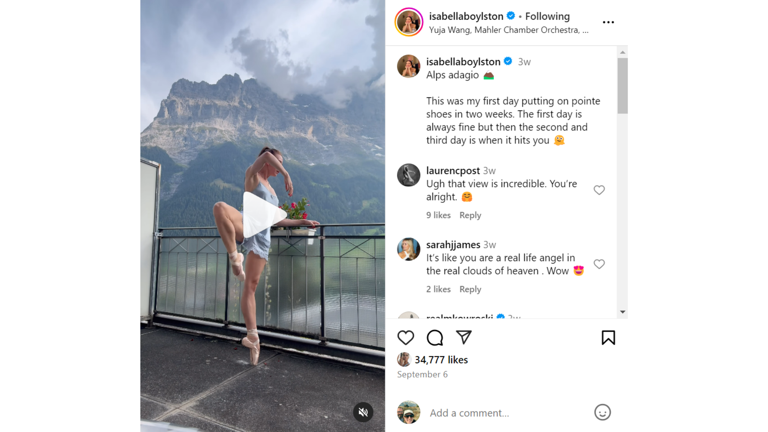 Dancing on a Roof with Misty Copeland - capturing an extraordinary moment in a personal setting with Misty Copeland (who's also built strong PSRs) makes them both feel iconic and approachable. Summer Photo Dump - casual, candid photo collections give followers a glimpse into an artist’s personal life, making them feel more connected. Admitting Pain - sharing struggles with pointe work makes the dancer more relatable, showing vulnerability and authenticity that resonates with followers. Isabella also comes off as sincere when she admits she's taken a break from wearing pointe shoes for a few weeks.