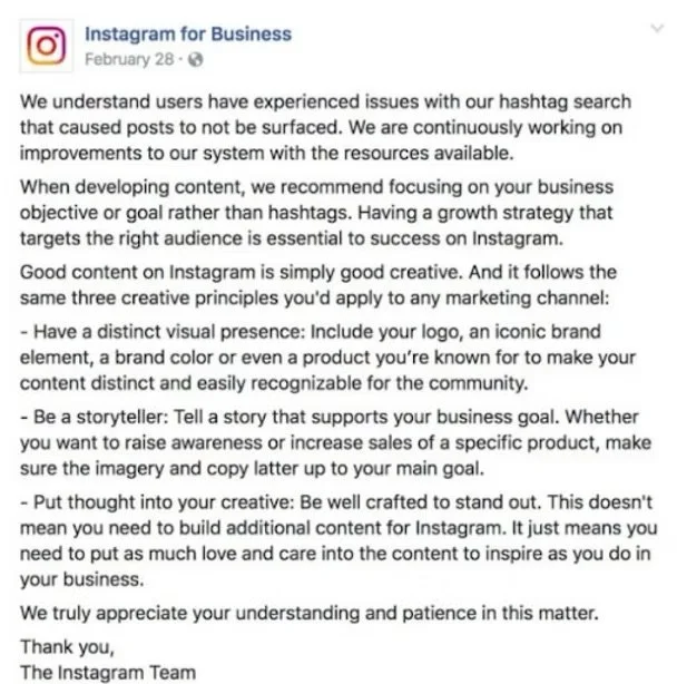 In February 2019, Instagram made a statement to address complaints users made regarding their content not appearing when they used specific hashtags on their Facebook Business page. In a way, Instagram admitted to their use of shadow banning in their statement.